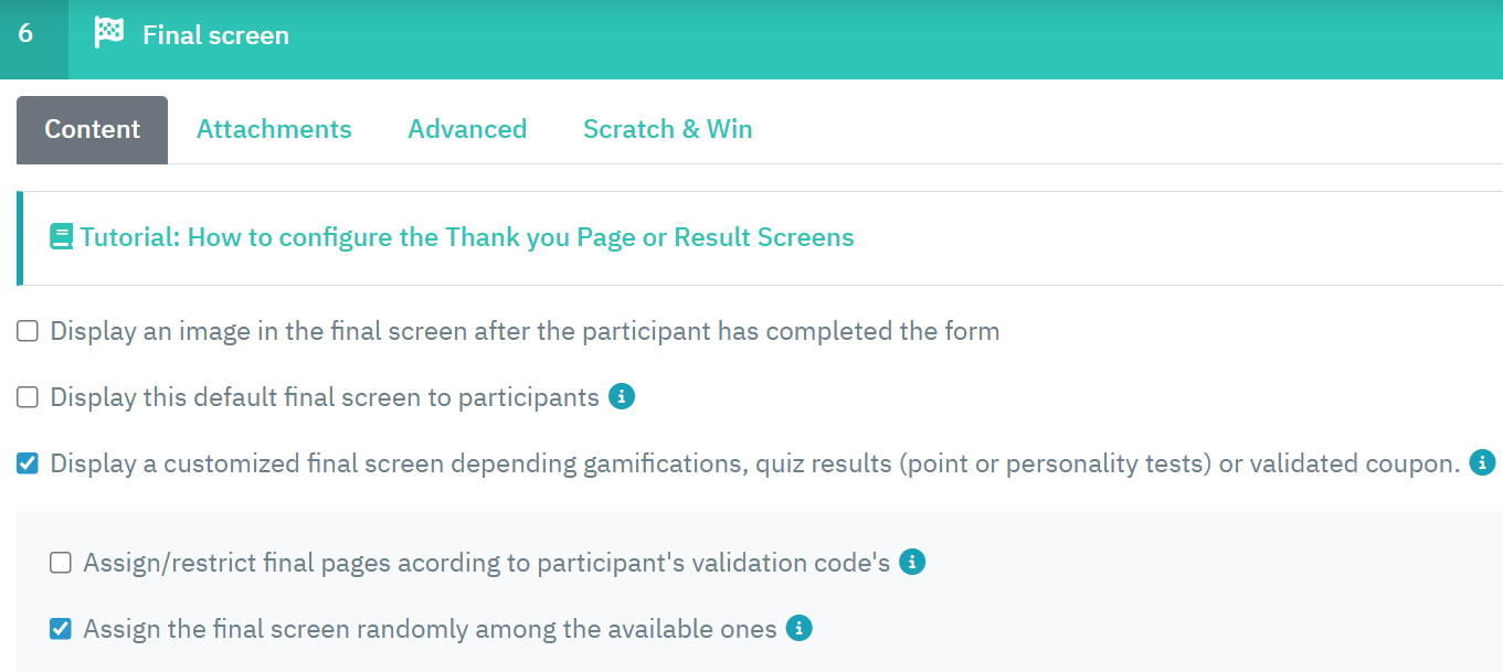 However, you can also configure final pages to be assigned randomly from a set of available screens. This option is useful when you want to show different final messages or distribute prizes randomly, without relying on rules, scores, or specific answers.
