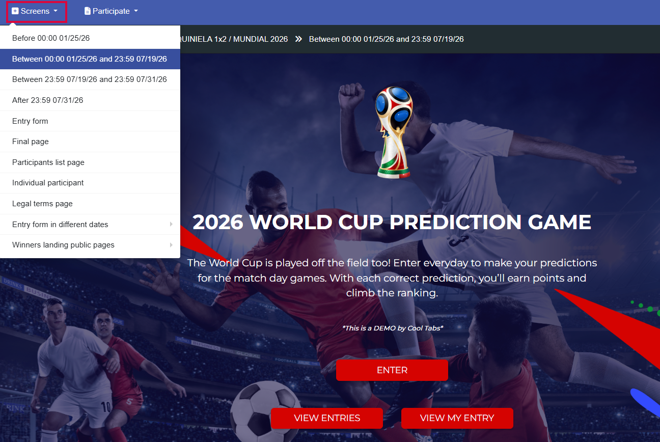 For the 2026 World Cup, Cool Tabs has created a preconfigured World Cup Pool template so you can launch a sports prediction campaign among your users quickly and easily.