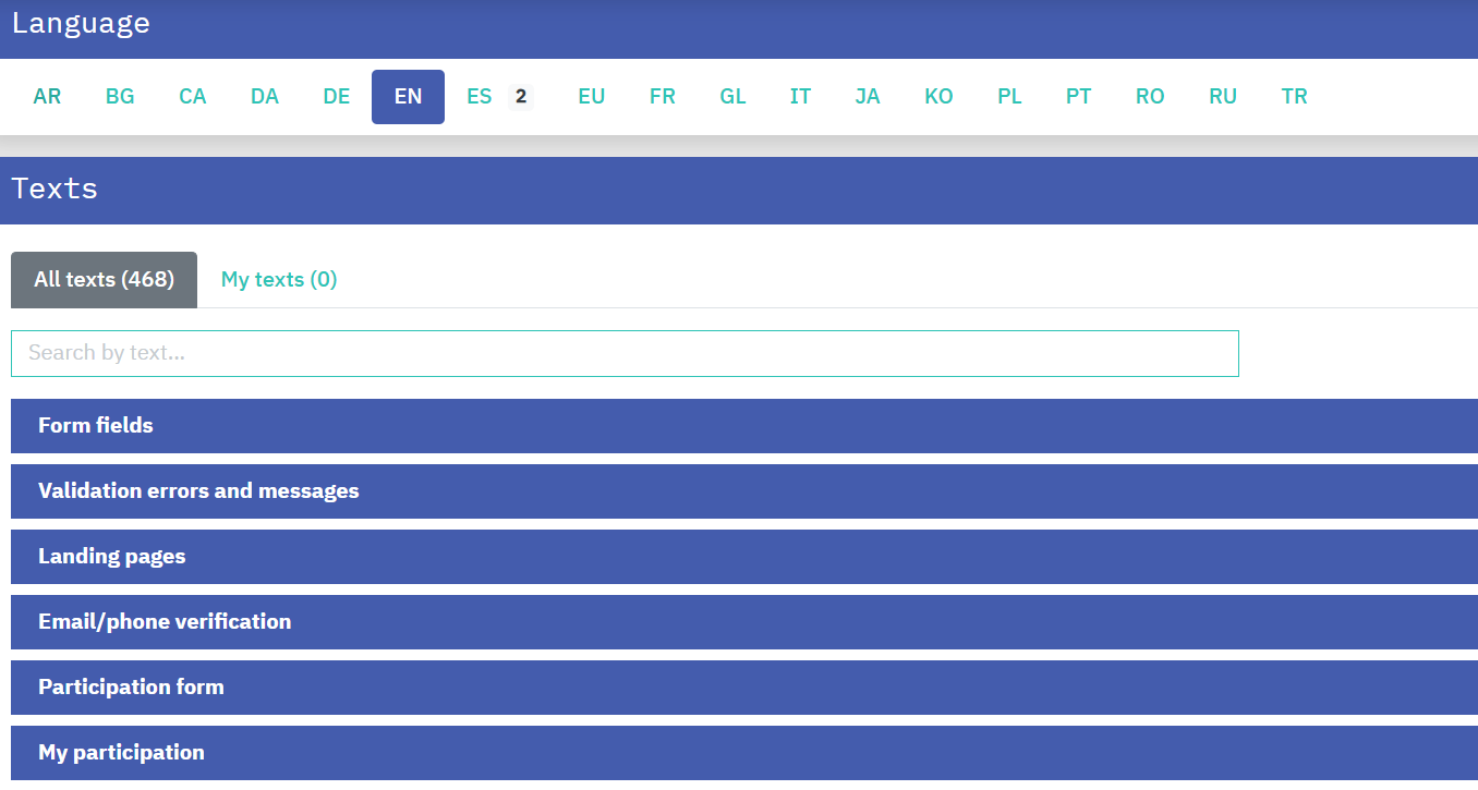 Texts: here you will find all the platform texts organized by categories. In total, you have 468 editable texts, grouped into: