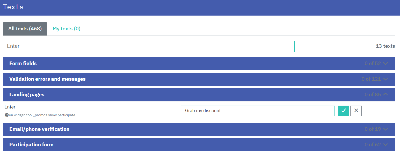 You can browse through the categories or use the Search by text search tool to quickly locate the text you want to modify. The My texts tab will show only those you have edited.