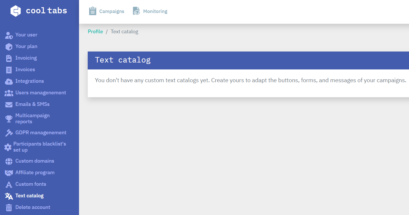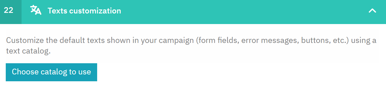 It works like an editable glossary. Each entry corresponds to a specific interface text that you can modify as you wish. Additionally, you can create multiple catalogs with different text combinations and assign them to the campaigns you need. In this tutorial, we explain how to set it up.