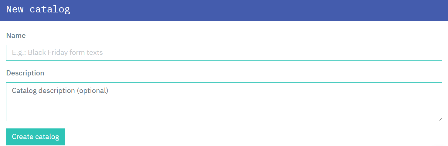 Go to your profile > Settings and click on Text Catalog in the left sidebar menu. If this is your first time accessing it, the section will appear empty. To create your first catalog, click the New catalog button.