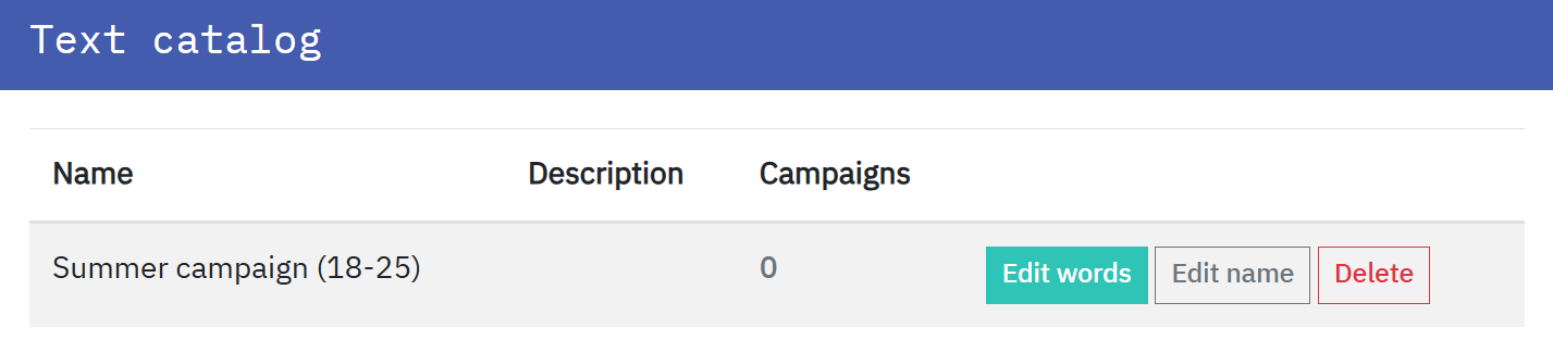 Once created, the catalog will appear in the Text Catalog list with its name, description, and the number of campaigns it is assigned to.