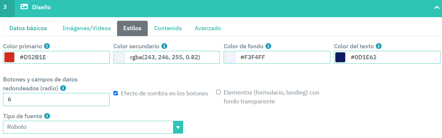 Cualquier cambio que quieras realizar en la apariencia de la landing, puedes hacerlo en los isguientes apartados de la sección 'Diseño' de la campaña.