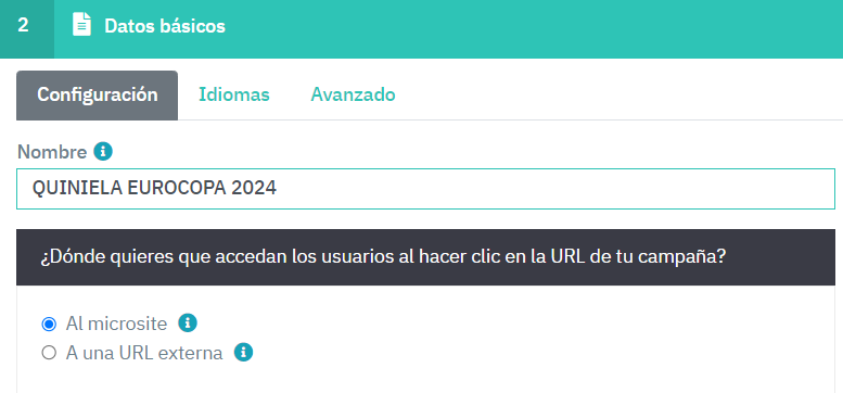 La plantilla tiene marcada, por defecto, la opción 'Microsite'. Significa que los usuarios, al pinchar en la URL de la quiniela, accederán al microsite que te proporciona Cool Tabs, donde está alojada la campaña.