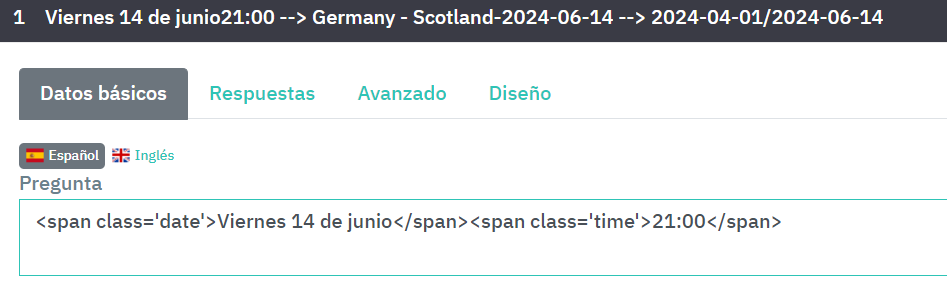 Esta plantilla tiene personalizadas las preguntas del quiz (los distintos partidos), indicando la fecha y la hora del encuentro. Puedes modificarlo, pero te recomendamos respetar la personalización que hemos incluído.
