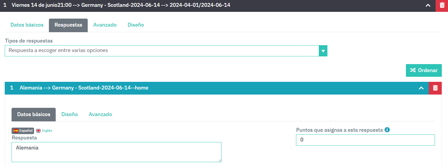 Como verás, el campo correspondiente a la asignación de puntos de cada opción de respuesta está a 0. Cuando se confirmen los resultados, podrás editar la campaña para asignar en cada partido una puntuación. Entonces podrás asignar 0 si es una respuesta incorrecta y 1 punto si es una respuesta correcta.