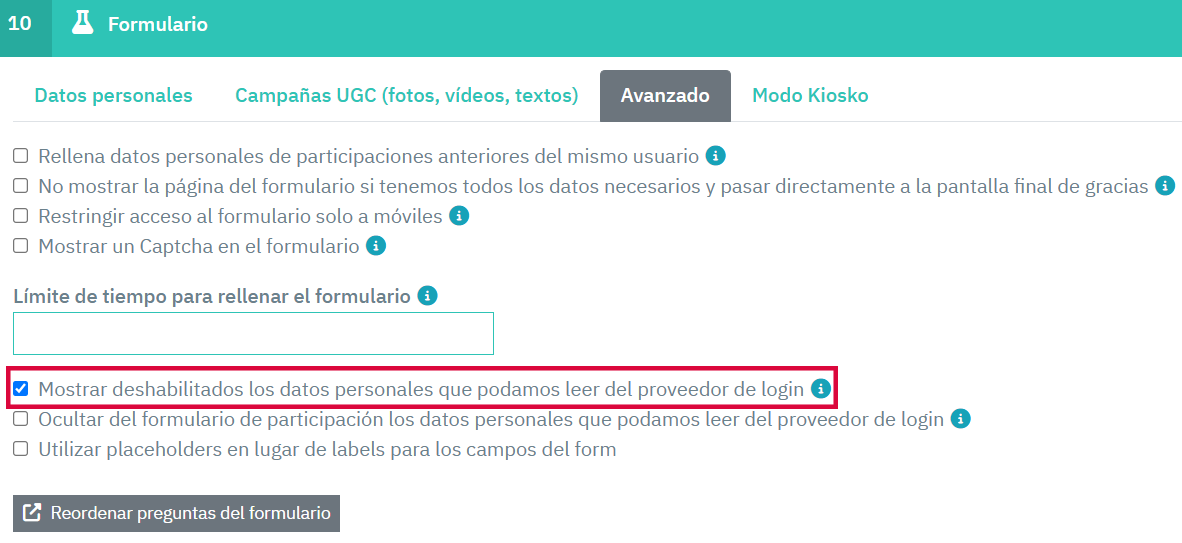 En Cool Tabs, hemos añadido una nueva opción en la sección Formulario de la edición de una campaña, que te permitirá mostrar ciertos campos personales de forma deshabilitada cuando la información provenga del proveedor de login. Esta funcionalidad está pensada para facilitar la gestión de los datos personales y evitar que los participantes puedan modificarlos, mejorando así la consistencia de la información en tus campañas.
