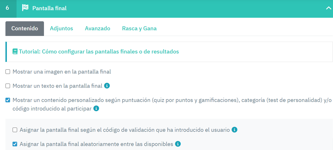 Asignar la pantalla final aleatoriamente entre las disponibles. Con esta opción activada, la plataforma mostrará una página final de forma aleatoria cuando el usuario termine la campaña.