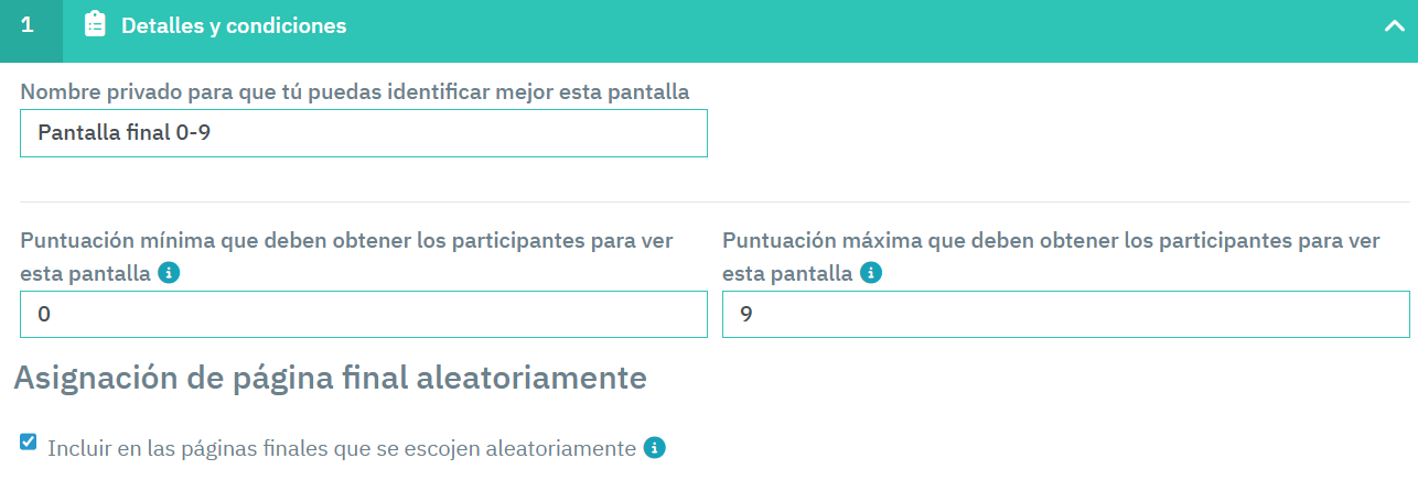 No obstante, también es posible configurar páginas finales que se asignen de forma aleatoria entre un conjunto de pantallas disponibles. Esta opción resulta útil cuando se quiere mostrar distintos mensajes finales o repartir premios de forma aleatoria, sin depender de reglas, puntuaciones o respuestas concretas.