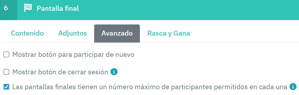 En el apartado Pantalla final > Avanzado, marca el check: Las pantallas finales tienen un número máximo de participantes permitidos en cada una.