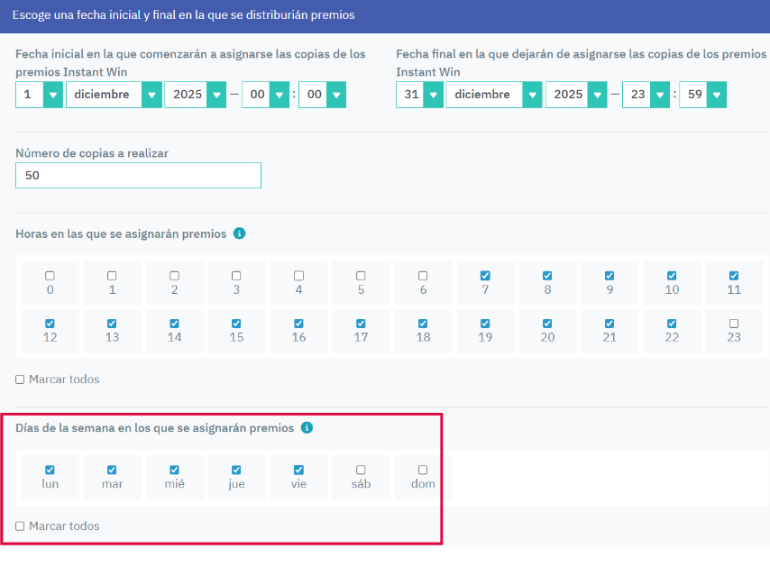 Selecciona los días en los que quieres que se asignen premios.