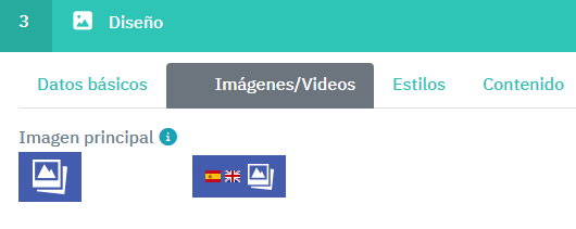 Dentro del editor de tu campaña, ve al apartado Diseño > Imágenes/Vídeos. Verás los distintos campos de imagen disponibles (imagen principal, imagen de fondo, imagen de fondo en móviles, etc.) y, junto a cada uno, un icono con banderas. Ese icono es el acceso al gestor de imágenes por idioma.