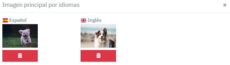 ¿Cómo elimino una imagen de un idioma concreto? Abre de nuevo el popup desde el icono de banderas y pulsa el botón de la papelera bajo la imagen del idioma que quieras eliminar. A partir de ese momento, ese idioma volverá a usar la imagen por defecto.