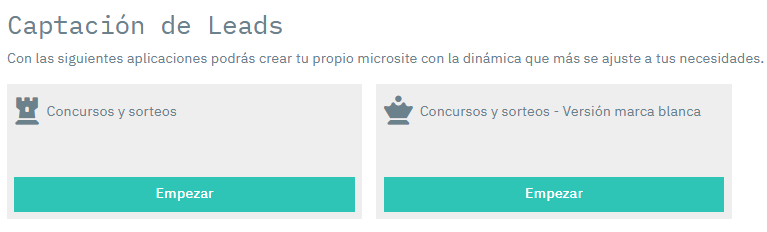 2) En el apartado Captación de leads, selecciona la opción Concursos y sorteos, en versión estándar o en marca blanca.
